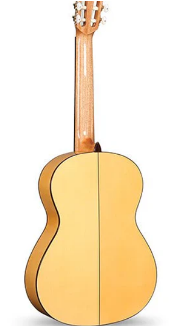 Eine weiße Flamencogitarre aus Bergahorn für Boden und Zargen, Fichtenholz für die Decke und einem mit Ebenholz verstärkten Hals.