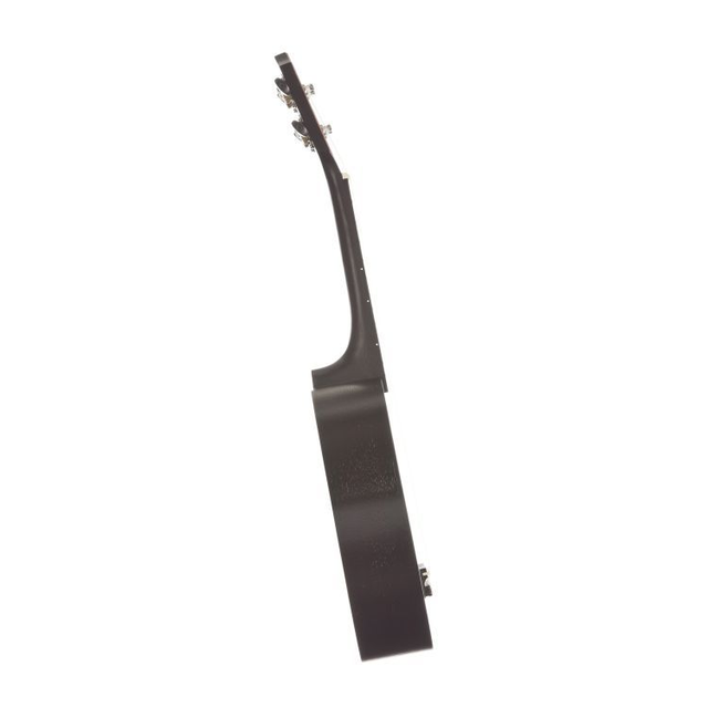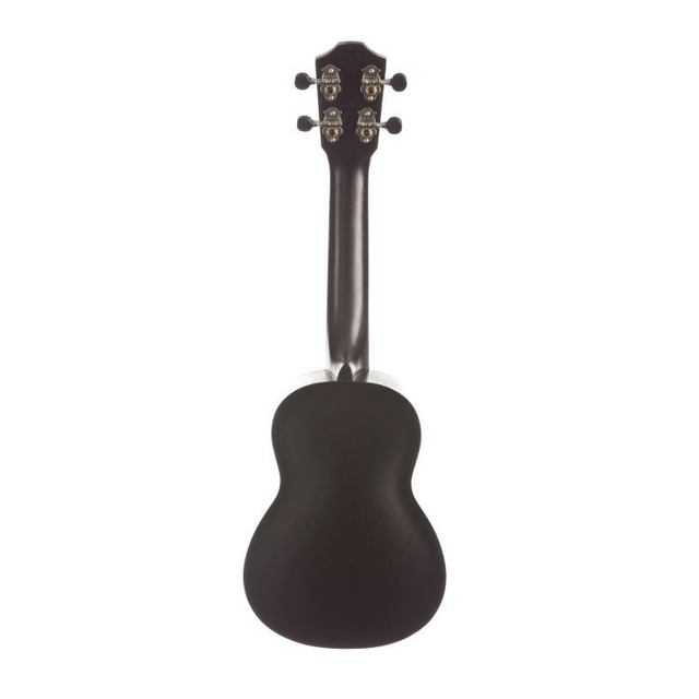 Sopran Ukulele, Korpus Mahagoni, Hals Nato, Griffbrett & Steg Walnuss, 12 Bünde, Sattel & Stegeinlage Nubone, Saiten Aquila Nylgut, Finish goth black matt offenporig, offene Gitarrenmechaniken chrom mit schwarzen Flügeln, Mensur 34cm, Sattelbreite 3,5cm