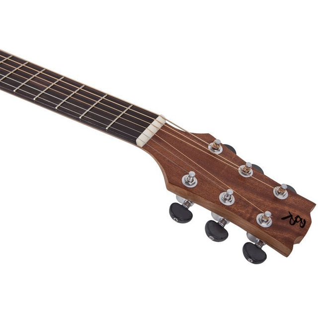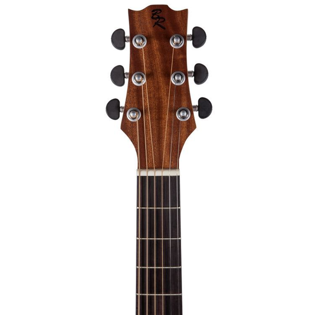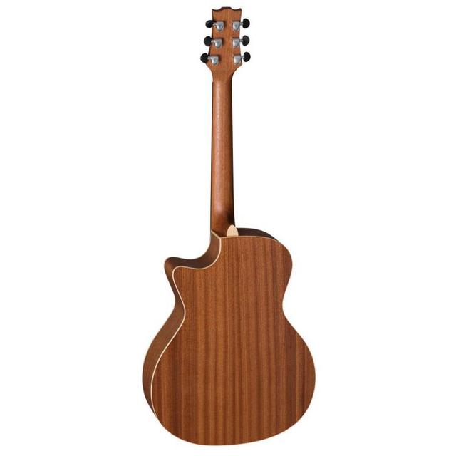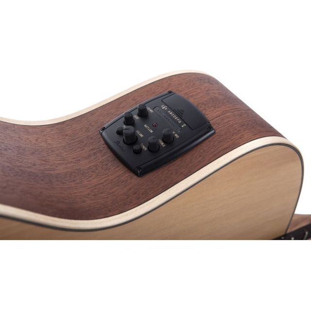 Auditorium Cutaway, Decke massive kanadische Zeder, Boden & Zargen Mahagoni, Hals Mahagoni, Griffbrett & Steg Ovangkol, 20 Bünde, Sattel & Stegeinlage Nubone, Saiten Elixir, Bindings Ahorn, Finish natur matt offenporig, Mechanik diecast matt chrom mit schwarzen Flügeln, Mensur 630mm, Sattelbreite 46mm, Pickup System Baton Rouge BR-2P by Shadow