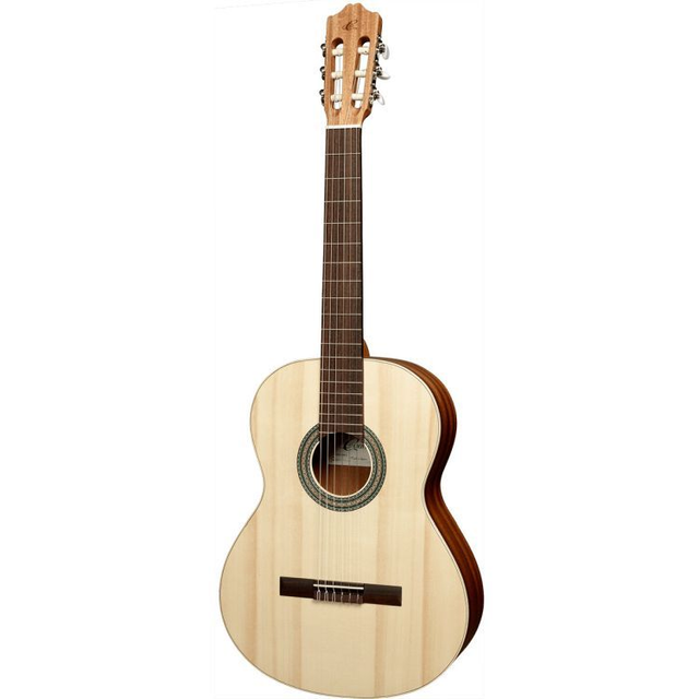 Ein begeisterndes spanisches Instrument im offenporigen, matt lackierten Naturfinish. Speziell geeignet für Einsteiger und als angenehmes Übungsinstrument. Mit massiver Fichtedecke und mit Boden, Zargen und komfortablen Hals aus Mahagoni. Ein einfaches Ahorn-Binding umfasst den oberen Zargenrand. Das Griffbrett ist aus Palisander. Die Zargenhöhe beträgt 95/102 mm. Das Satinfinish erlaubt optimale Klangentfaltung.