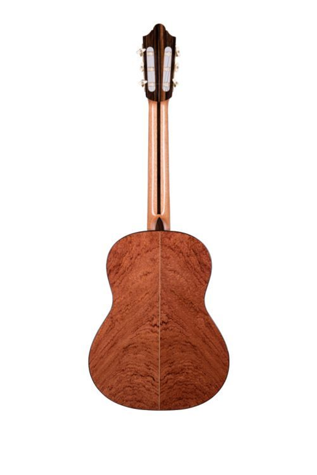 Klassik 3/4, Decke massive kanadische Zeder, Boden & Zargen Bubinga, Hals Cedro mit Palisander- Verstärkung, Spanische Hals-Korpus Verbindung, Griffbrett & Steg ostindischer Palisander, Sattel und Stegeinlage Knochen, Finish hochglanz, Mechanik DER JUNG, Binding ostindischer Palisander, Saiten Savarez, Mensur 580 mm, Sattelbreite 50 mm. Jedes Instrument wird vor dem Versand in der Schweiz oder in Deutschland (Tübingen) baulich und klanglich optimiert.