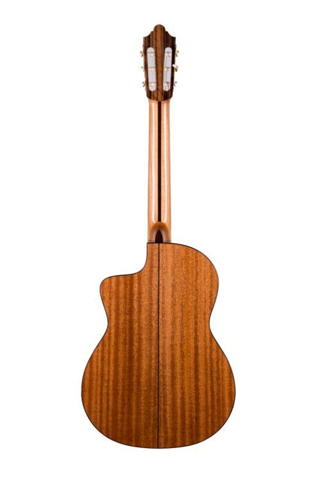 Klassik 4/4 Cutaway Elektrik, Decke massive Schweizer Alpenfichte, Boden & Zargen Mahagoni massiv, Hals Cedro mit Palisander- Verstärkung, Spanische Hals-Korpus Verbindung, Griffbrett & Steg ostindischer Palisander, Sattel und Stegeinlage Knochen, Finish hochglanz, Mechanik DER JUNG, Binding ostindischer Palisander, Saiten Savarez, Mensur 650 mm, Sattelbreite 52 mm, Pickup Mi-Si. Jedes Instrument wird vor dem Versand in der Schweiz oder in Deutschland (Tübingen) baulich und klanglich optimiert.