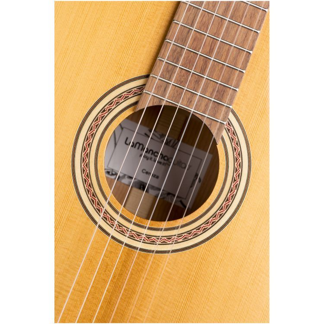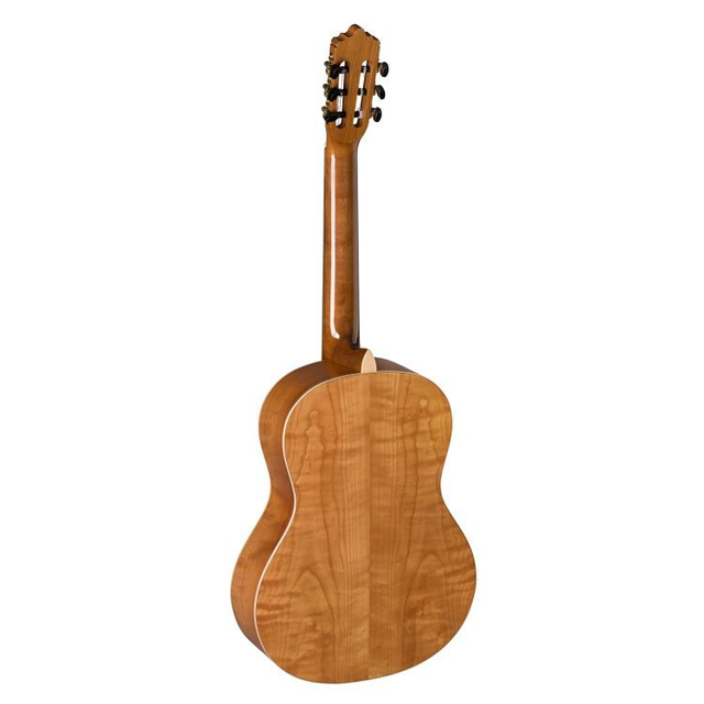 Klassik 4/4, Hölzer by rECOtimber, Decke massive deutsche Fichte, Boden & Zargen Kirsche, Hals Erle mit Karbon-Verstärkung, spanische Hals-Korpus Verbindung, Griffbrett Eukalyptus, Steg Eukalyptus mit Doppelbohrung, Sattel und Stegeinlage Knochen, Saiten Savarez Cantiga Mixed Tension 510MRJ, Bindings Ahorn, Finish natur hochglanz, Mechanik gold plated mit schwarzen Flügeln, Mensur 650 mm, Sattelbreite 52 mm.
