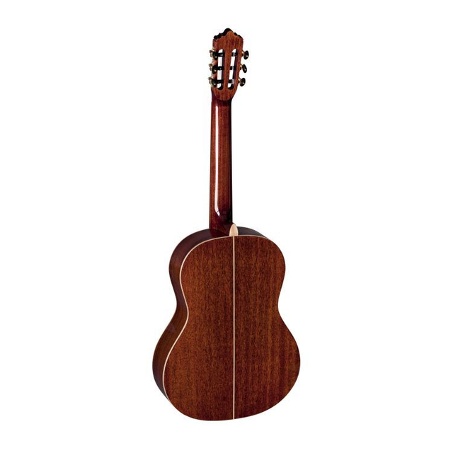 Klassik 4/4, Decke massive kanadische Zeder, Boden Mahagoni massiv, Zargen Mahagoni, Hals Toona Kalantas mit Karbon-Verstärkung, spanische Hals-Korpus Verbindung, Griffbrett Ovangkol, Steg Ovangkol mit Doppelbohrung, Sattel und Stegeinlage Knochen, Saiten Savarez Cantiga Mixed Tension 510MRJ, Bindings Ahorn, Finish natur hochglanz, Mechanik deluxe gold plated mit schwarzen Flügeln, Mensur 650 mm, Sattelbreite 52 mm