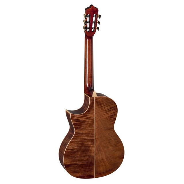 Klassik 4/4 Cutaway, Small Neck, Decke massive deutsche Fichte, Boden & Zargen Exotic-Mahagoni, Hals Toona Kalantas mit Karbon-Verstärkung, spanische Hals-Korpus Verbindung, Griffbrett Ovangkol, Steg Ovangkol mit Doppelbohrung, Sattel und Stegeinlage Knochen, Saiten Savarez Cantiga Mixed Tension 510MRJ, Bindings Ahorn, Finish natur/dark stained hochglanz, Mechanik deluxe gold plated mit schwarzen Flügeln, Mensur 650 mm, Sattelbreite 48 mm, Pickup System BR-1