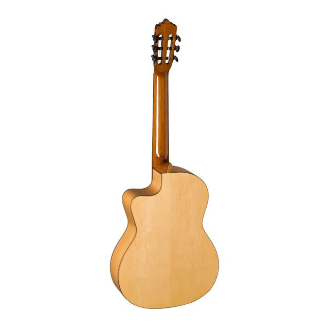 Klassik 4/4 Cutaway, Decke massive deutsche Fichte, Boden & Zargen gemasertes Ahorn, Hals Toona Kalantas mit Karbon-Verstärkung, spanische Hals-Korpus Verbindung, Griffbrett Ovangkol, Steg Ovangkol mit Doppelbohrung, Sattel und Stegeinlage Knochen, Saiten Savarez Cantiga Mixed Tension 510MRJ, Bindings Walnuss, Finish amber/natur hochglanz, Mechanik Deluxe schwarz mit schwarzen Flügeln, Mensur 650 mm, Sattelbreite 52 mm, Pickup System BR-1 (Undersaddle-Piezo-Pickup in Kombination mit einem schlichten aktiven Preamp).