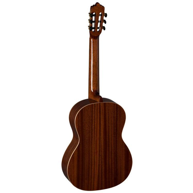 Klassik 4/4, Decke massive kanadische Zeder, Boden & Zargen Mahagoni, Hals Toona Kalantas mit Karbon-Verstärkung, spanische Hals-Korpus Verbindung, Griffbrett Ovangkol, Steg Ovangkol mit Doppelbohrung, Sattel und Stegeinlage Knochen, Saiten Savarez Cantiga Mixed Tension 510MRJ, Bindings Ahorn, Finish natur hochglanz, Mechanik gold plated mit schwarzen Flügeln, Mensur 650 mm, Sattelbreite 52 mm