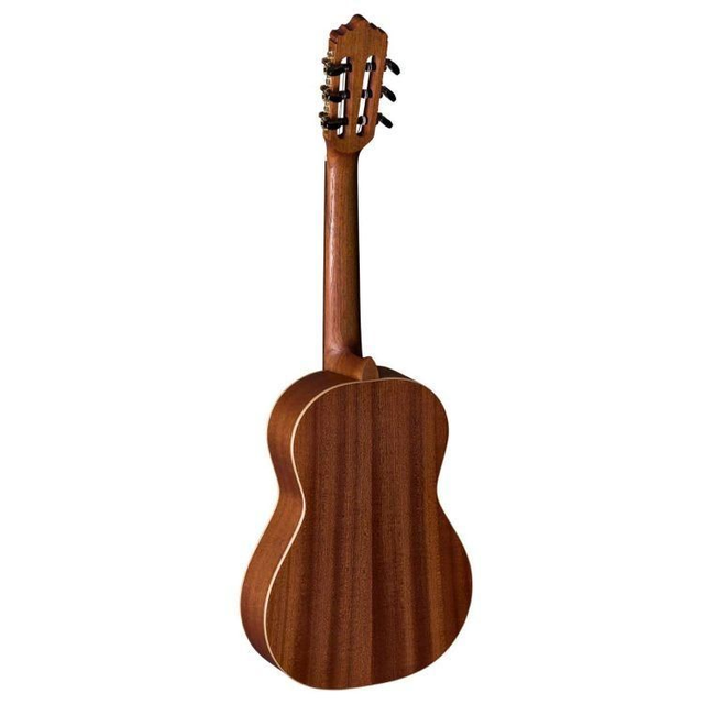 Klassik 1/2, Decke massive kanadische Zeder, Boden & Zargen Mahagoni, Hals Toona Kalantas mit Karbon-Verstärkung, spanische Hals-Korpus Verbindung, Griffbrett Ovangkol, Steg Ovangkol mit Doppelbohrung, Sattel und Stegeinlage Knochen, Saiten Savarez Cantiga High Tension 510AJ, Bindings Ahorn, Finish natur matt offenporig, Mechanik gold plated mit schwarzen Flügeln, Mensur 530 mm, Sattelbreite 48 mm, von der EGTA empfohlenes Modell 2017/2018