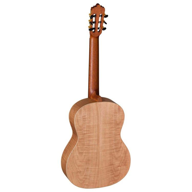 Klassik 7/8, Decke massive deutsche Fichte, Boden & Zargen Exotic-Mahagoni, Hals Toona Kalantas mit Karbon-Verstärkung, spanische Hals-Korpus Verbindung, Griffbrett Ovangkol, Steg Ovangkol mit Doppelbohrung, Sattel und Stegeinlage Knochen, Saiten Savarez Cantiga Mixed Tension 510MRJ, Bindings Ahorn, Finish natur/dark stained matt offenporig, Mechanik gold plated mit schwarzen Flügeln, Mensur 630 mm, Sattelbreite 52 mm, von der EGTA empfohlenes Modell 2017/2018
